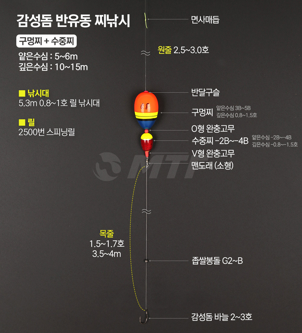 - 얕은 곳(3~5 m)은 3B 찌 + -3B 수중찌, 근거리 짧은 캐스팅이 효율적