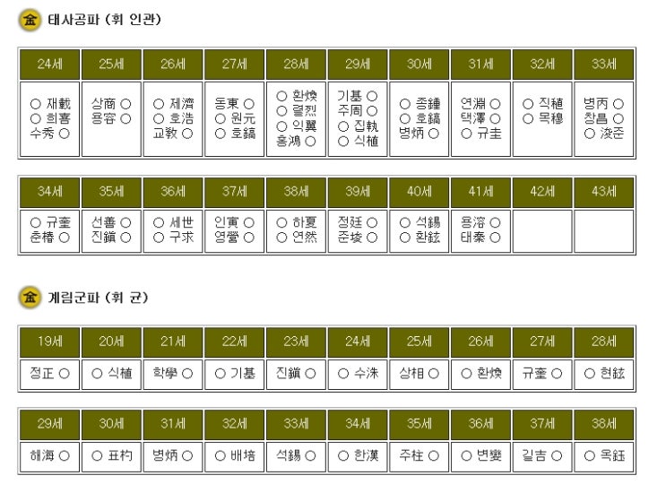 경주 김씨(慶州 金氏) 계림군파(鷄林君派) 항렬표(行列表)