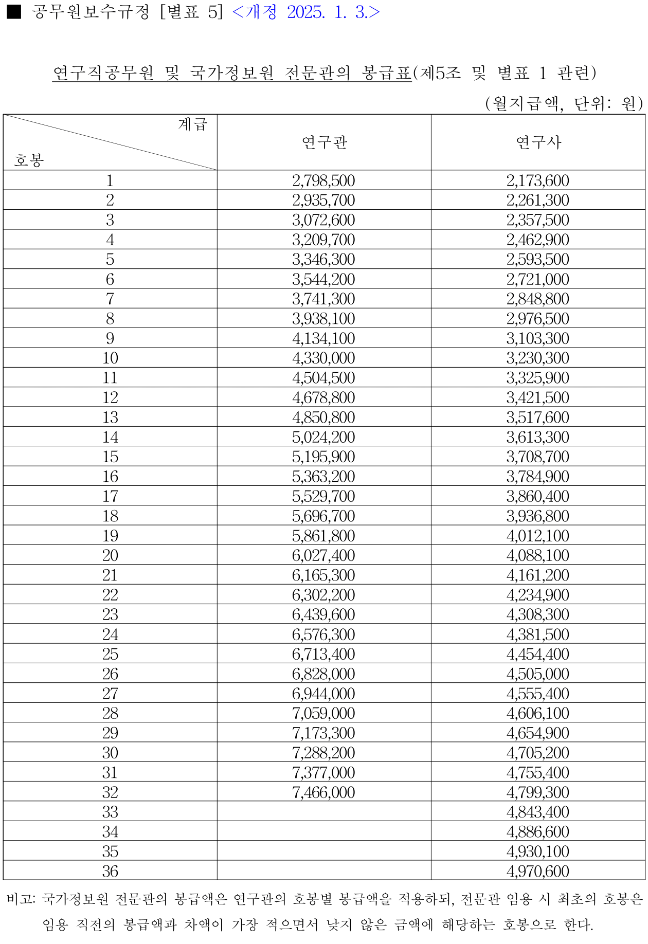 - 연구사: 1호봉 2,173,600원 → 36호봉 4,970,600원