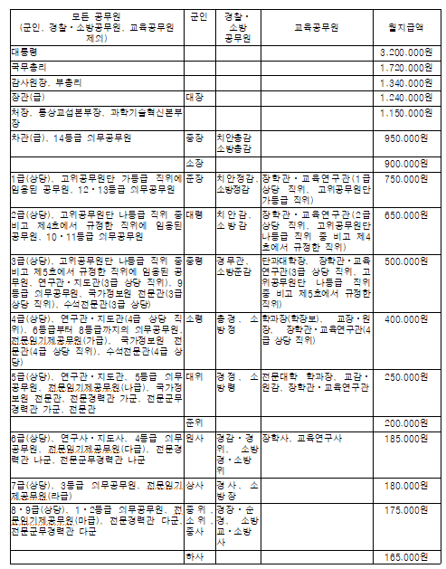 - 장차관급, 특보급 직급보조비: 1,340,000원