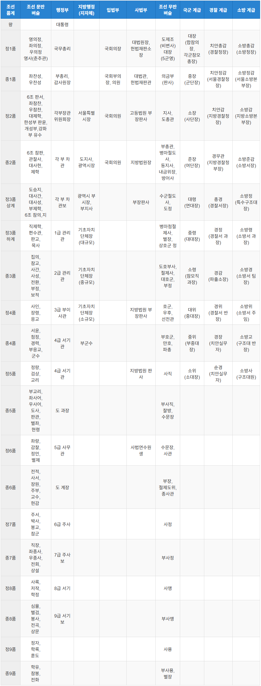 조선시대 품계와 현대 공무원 서열 비교