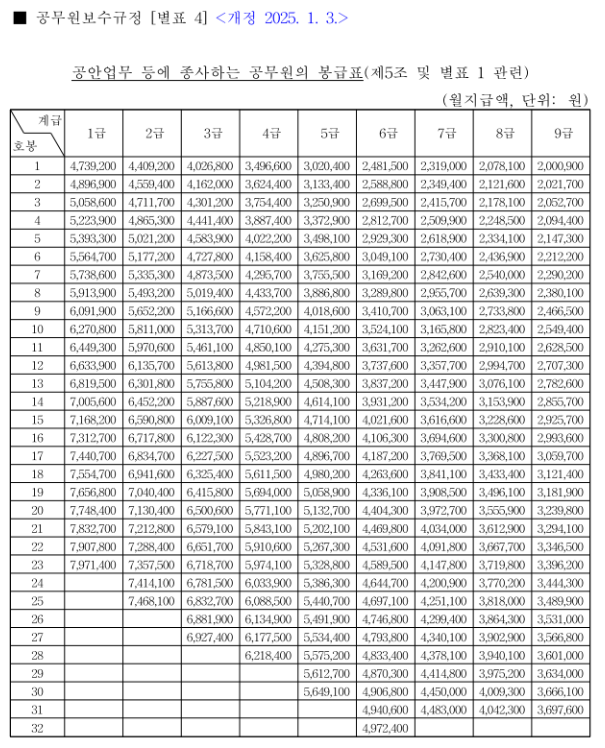 공무원의 봉급은 매년 국가 예산과 정책에 따라 인상률이 결정되며, 2025년에는 약 3.0% 인상이 예정되어 있습니다. 그중에서도 공안직 공무원(경찰, 소방, 교정 등)은 특수성에 따라 일반직 공무원에 비해 일부 수당이 더 지급되기도 합니다.