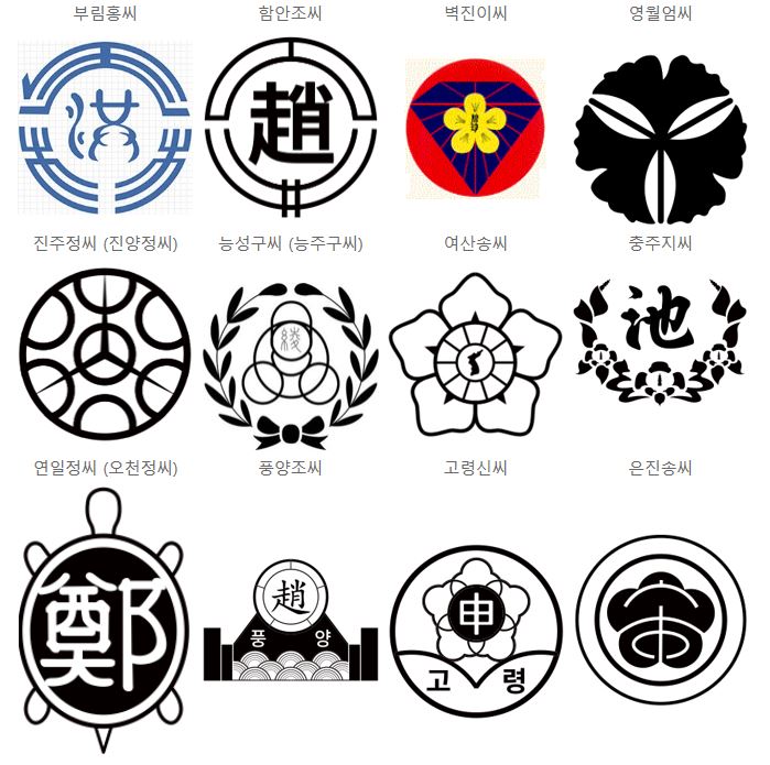 부림홍씨 함안조씨 엠블럼 벽진이씨 영월엄씨 진주정씨(진양정씨) 종문 능성구씨(능주구씨) 여산송씨 충주지씨 연일정씨(오천정씨) 풍양조씨 고령신씨 은진송씨 엠블럼