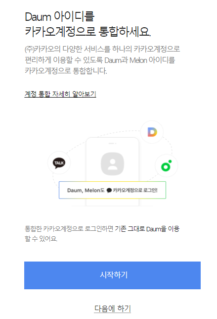 - 새 카카오 계정으로 통합: 이후 원하는 카카오 계정으로 다시 다음 계정(메일)을 연결할 수 있습니다.
