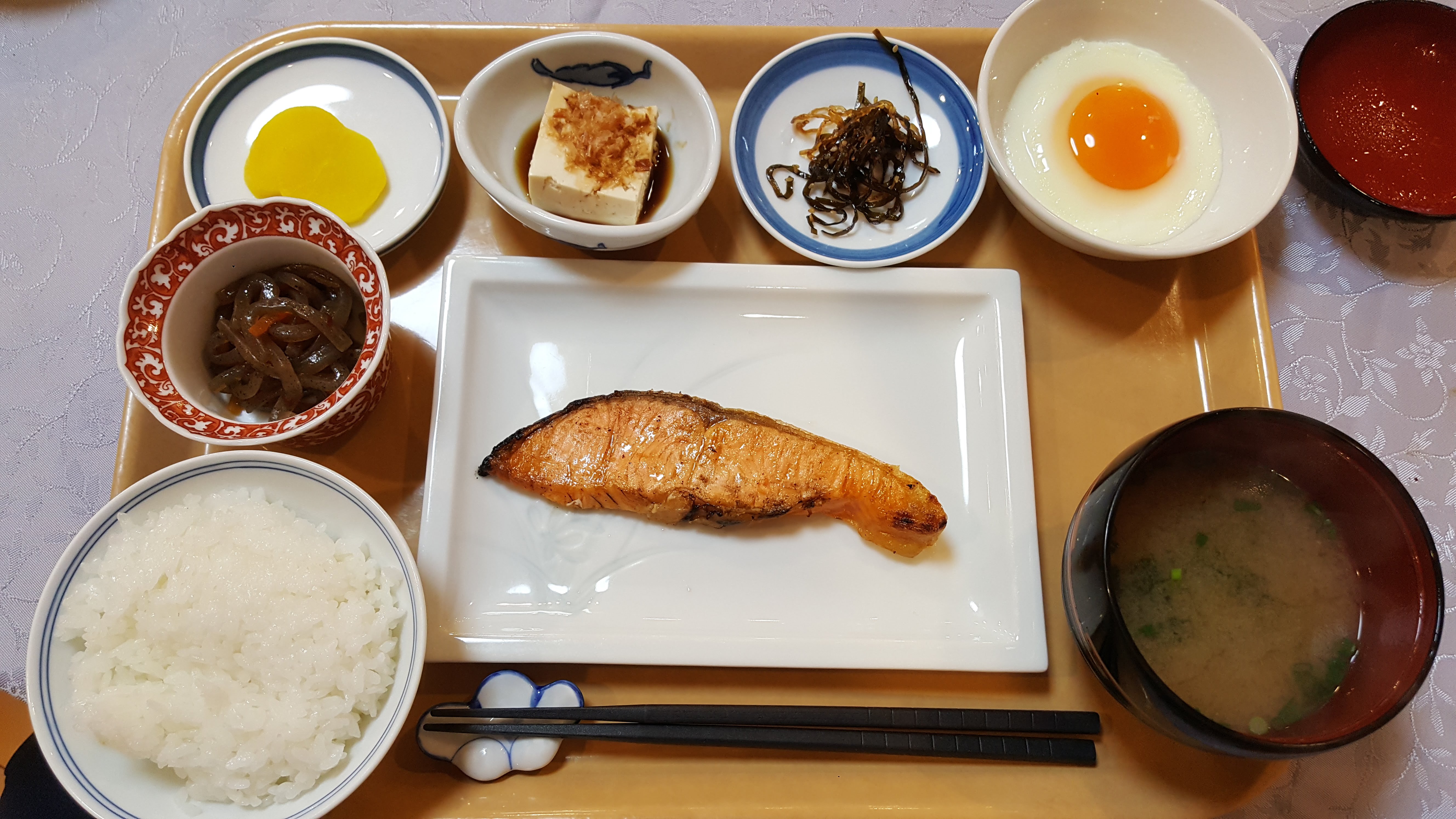 호텔 조식은 기본적인 일본식 뷔페 스타일이었습니다. 밥, 미소국, 생선구이, 김, 계란말이 등 간단한 메뉴지만 깔끔했습니다.
