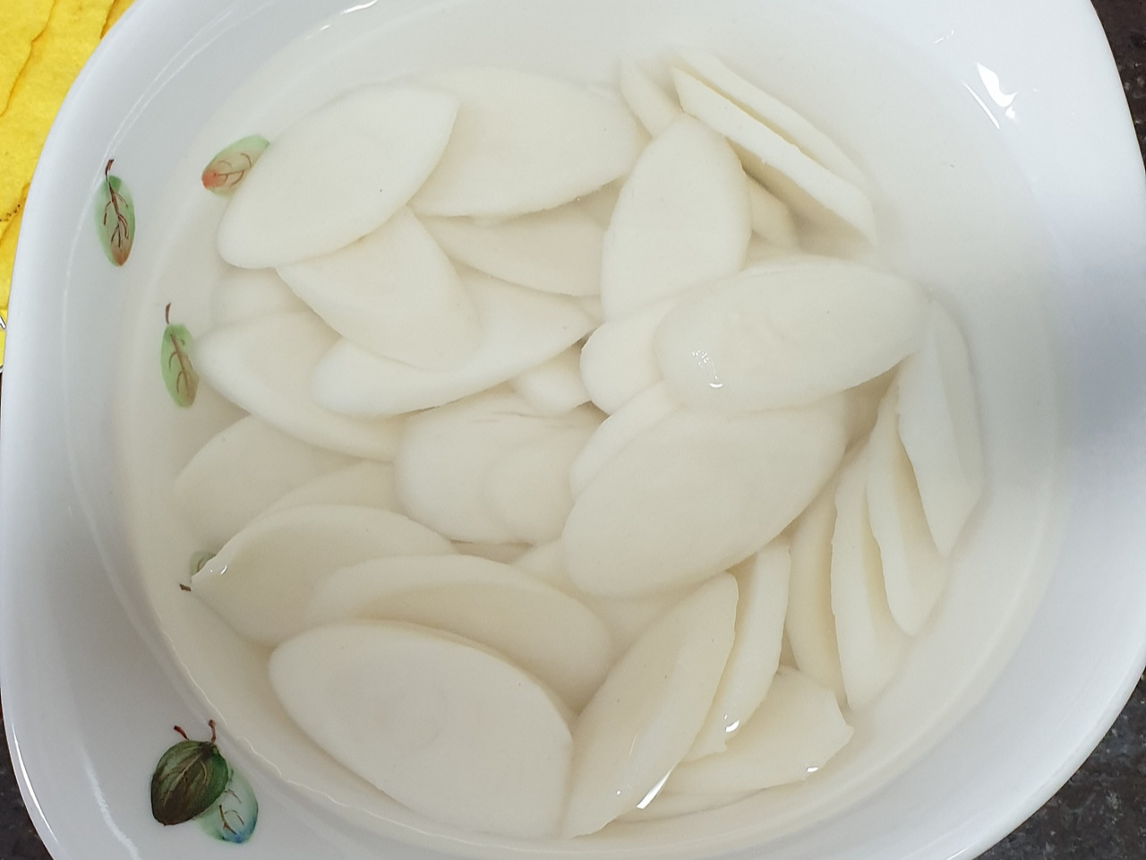 - 가래떡은 찬물에 약 30분간 불려둡니다. 이렇게 해야 떡이 국물 속에서 잘 풀어지지 않고, 동시에 부드럽게 익어 국물 맛을 흡수하게 됩니다.