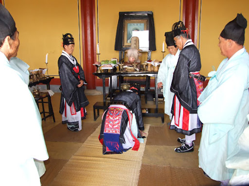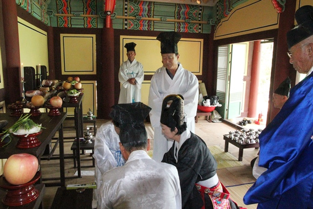 - 고인의 영정을 상 위에 두고, 유족들은 순서대로 헌작(술을 올림)을 하며 절을 합니다.