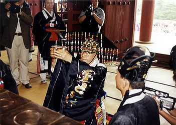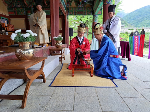 - 고인의 영정을 상 위에 두고, 유족들은 순서대로 헌작(술을 올림)을 하며 절을 합니다.
