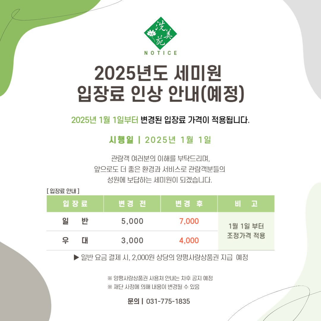 - 일반(만 19세 이상): 7,000원 - 현장 결제 시 ‘양평사랑상품권 2,000원’ 즉시 지급