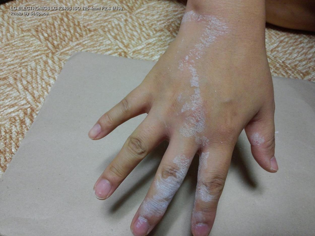 얼마 전에 퇴근해서 주차하고 있는데, 아내에게서 전화가 왔어요. "어디야? 빨리 와! 큰일 났어!" 대단히 큰일인 줄 알고 올라갔더니, 손에 순간접착제를 쏟았다더군요. 위와 아래 사진에 보시다시피 허옇게 굳어버렸었네요. 순간접착제가 손에 묻자마자 지운다고 물로 씻었답니다. 덕분에 저렇게 곱게 하얗게 돼버린 거죠.