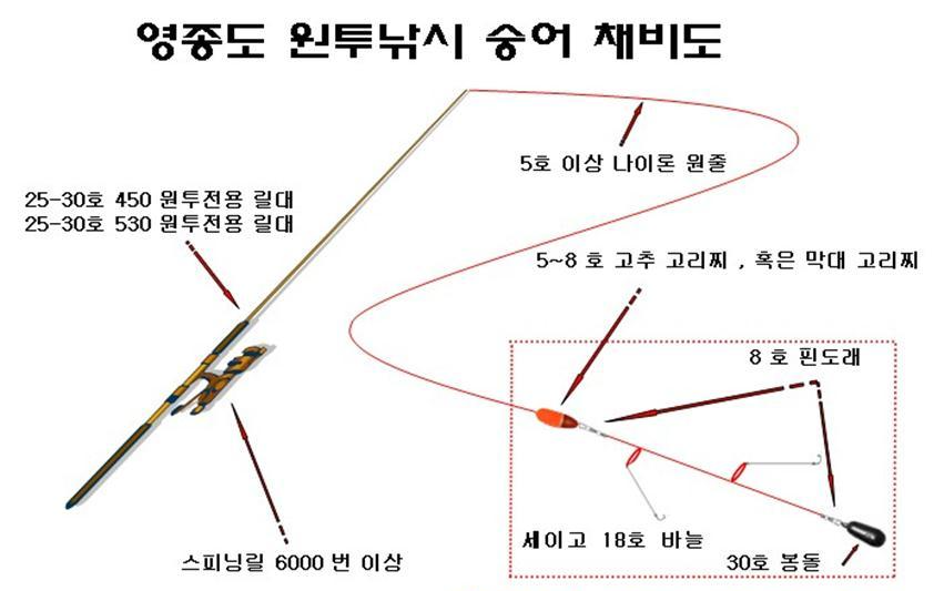 - 원줄: PE 3호 또는 나일론 5호(0.37 mm), 쇼크리더 8~10호 플루오카본 3 m