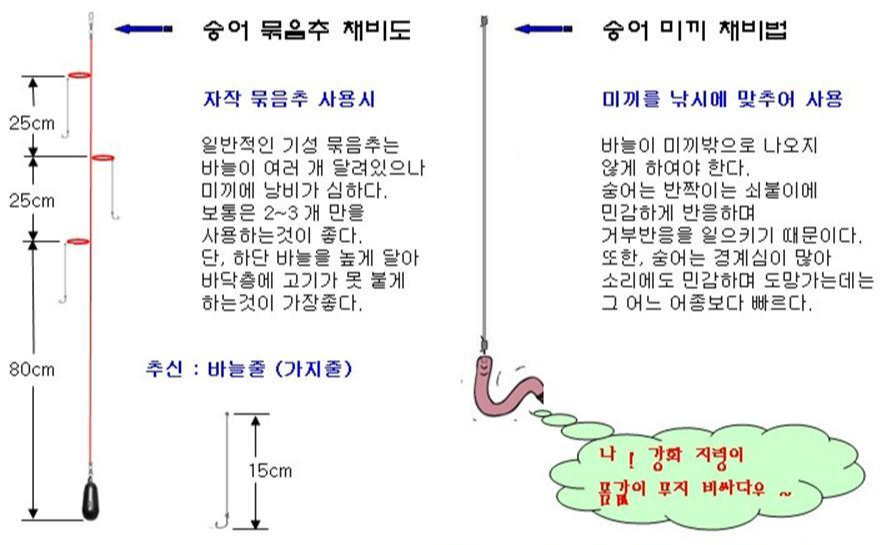- 바늘: 숭어 전용 15~16호(역날), 길쭉한 형태가 흡입 시 걸림률 우수