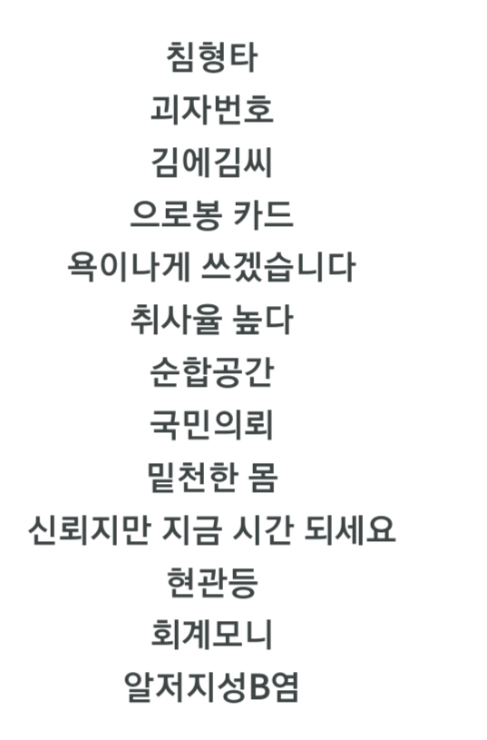 기상천외한 오타 모음 - 욕이나게 침형타, 괴자번호, 김에김씨, 으로봉카드, 취사율 높다, 순합공간, 국민의뢰, 밑천한 몸, 신뢰지만 지금 시간되세요, 현관등, 회계모니, 알저지성B염