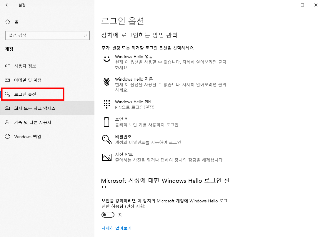 로그인 옵션 설정 변경