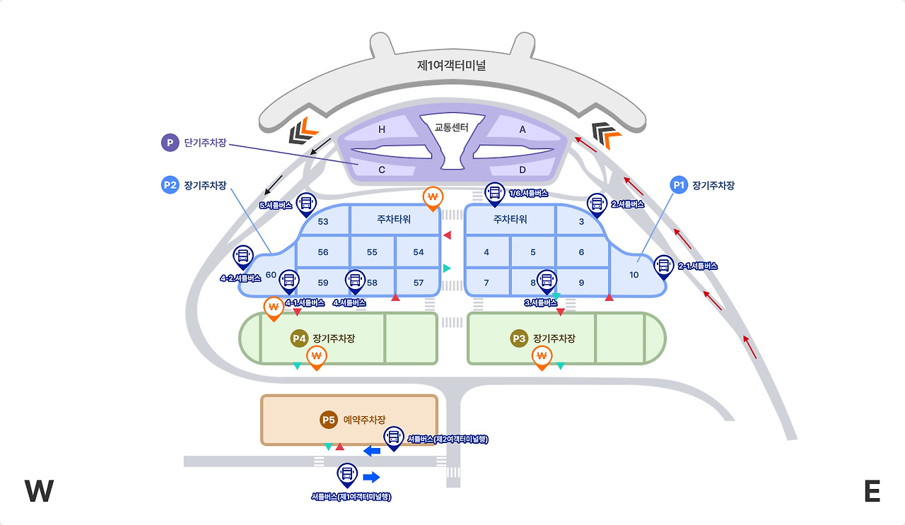 - T1(P3, P5 주차타워)·T2 장기주차장