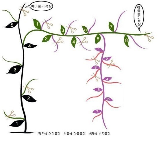 - 원줄기에서 3, 4, 5번째 곁순은 아들줄기로 키움