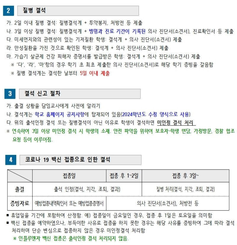 - 학생의 학습 보충: 승인받았다면, 결석 기간 중 못 다 한 학습을 나중에 보충할 수 있도록 교사와 협의