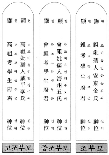 - 할머니: 顯祖妣孺人ㅇㅇㅇ氏神位 (현조비유인ㅇㅇㅇ씨신위)