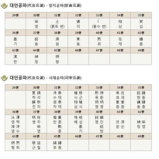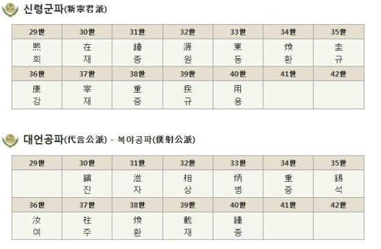 29세 영(永) - 30세 채(采) - 31세 훈(勳) - 32세 기(起) - 33세 용(鏞) - 34세 태(泰) - 35세 상(相) - 36세 희(熙) - 37세 규(圭) - 38세 종(鍾) - 39세 락(洛) - 40세 병(秉)