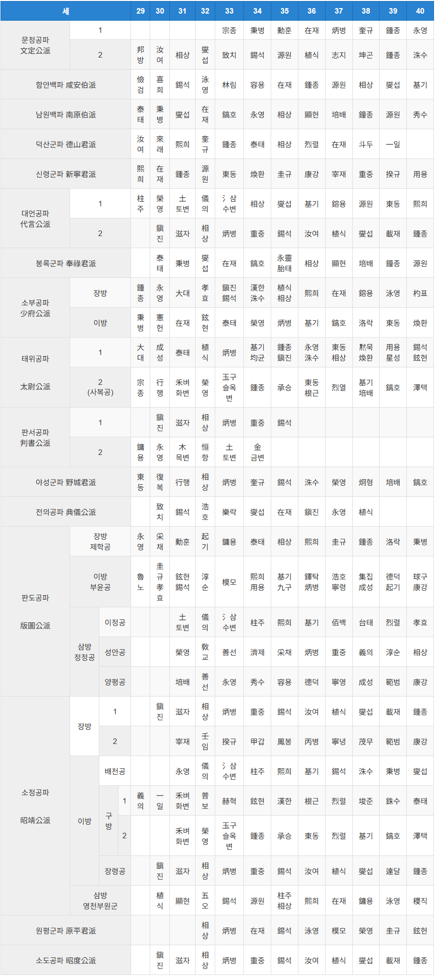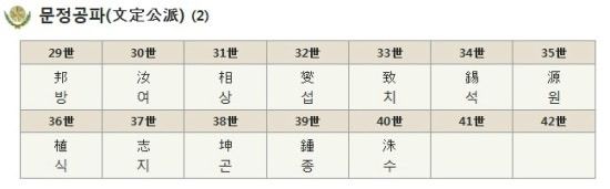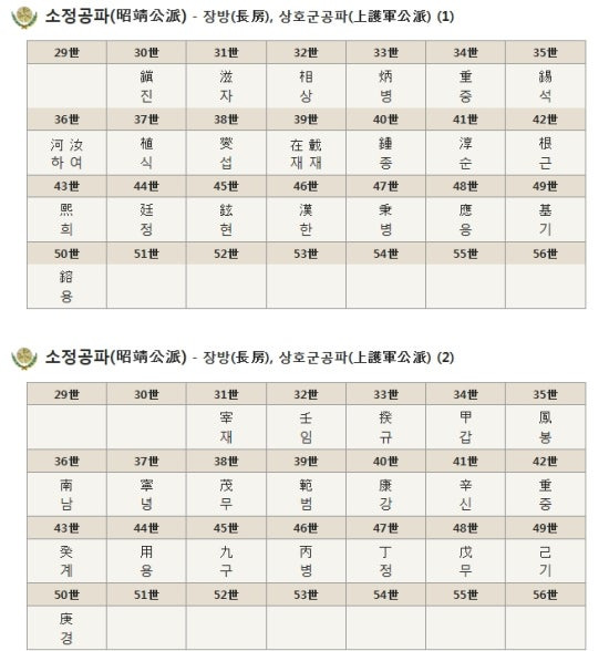 29세 장(章/장방) - 30세 진(鎭) - 31세 자(滋) - 32세 상(相) - 33세 병(炳) - 34세 중(重) - 35세 석(錫) - 36세 여(汝) - 37세 식(植) - 38세 섭(燮) - 39세 재(載) - 40세 종(鍾)