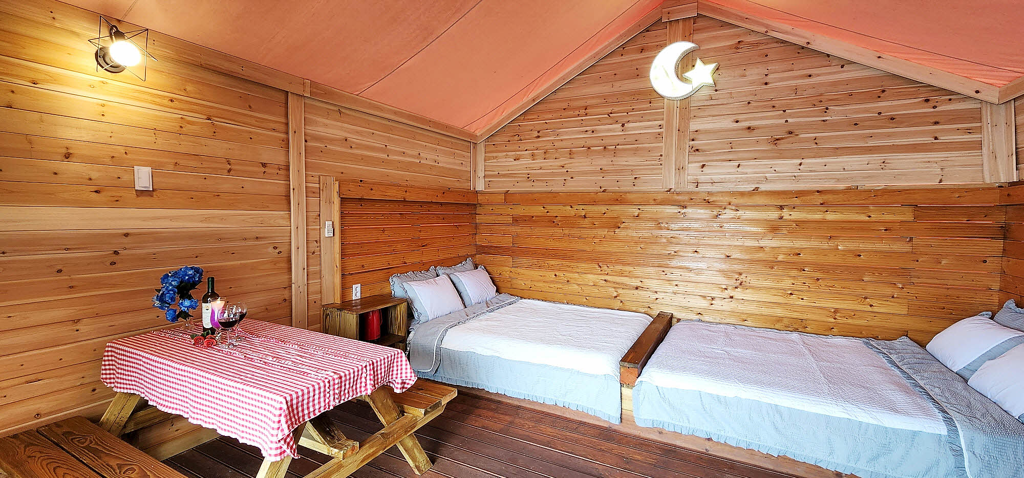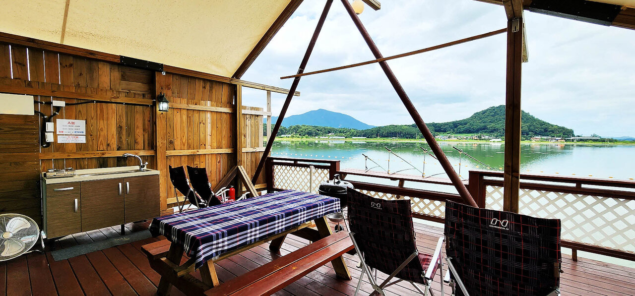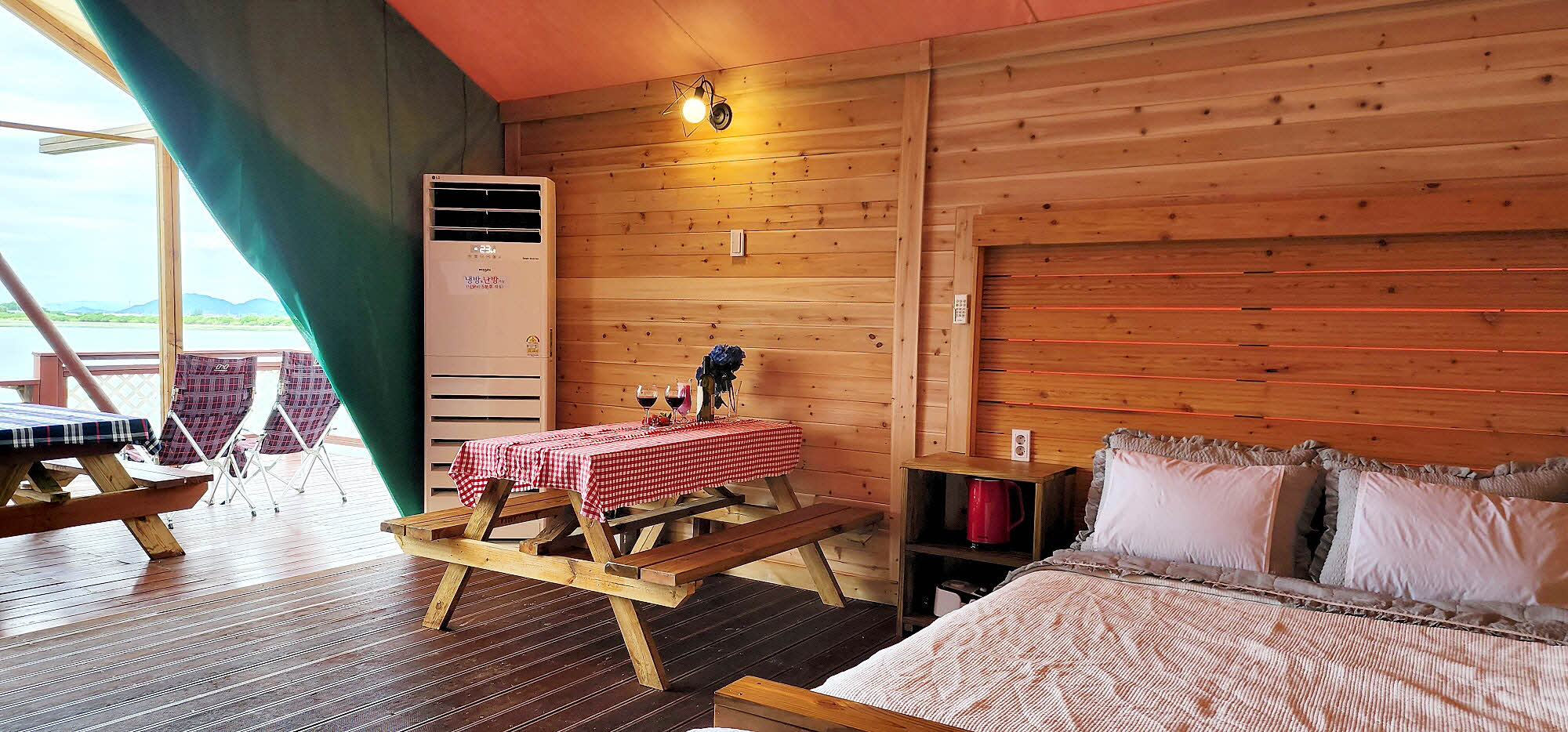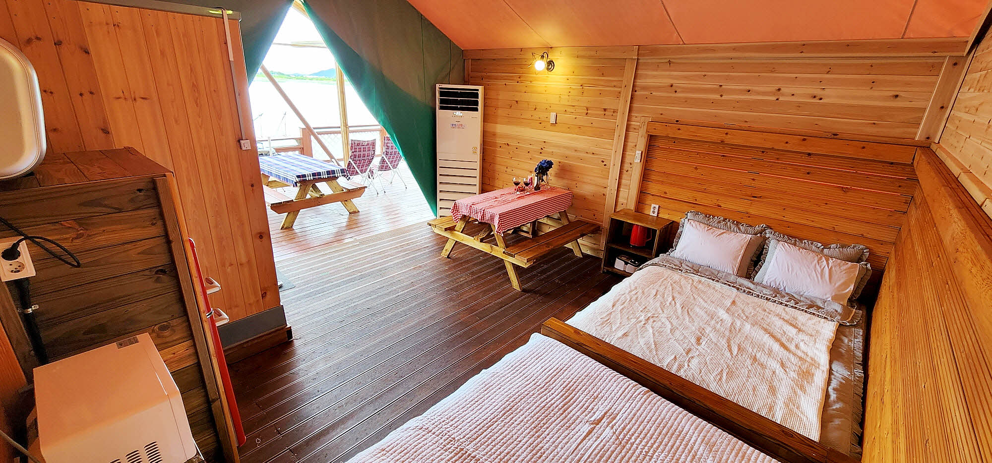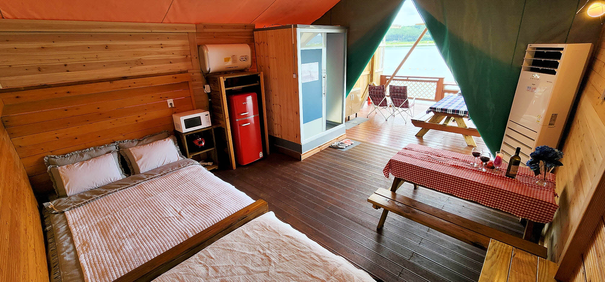 냉정저수지 위로 살포시 떠 있는 우드 데크 위 카바나형 숙소. 객실마다 낚싯대 거치대가 설치돼 있어 ‘베란다 떡밥 투척’이 가능하며, 빌트인 바비큐 시설과 전자레인지·밥솥·에어컨까지 구비돼 편의성도 뛰어납니다. 호수 위에 하늘이 투영되는 일몰·일출 풍경은 덤.