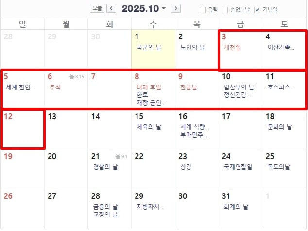 올해의 추석은 10월 6일(월요일)부터 8일(수요일)까지입니다. 여기에 법정공휴일인 개천절(10월 3일, 금), 대체공휴일 한글날(10월 9일, 목), 그리고 주말까지 포함하면 이미 8일의 연휴가 확보되어 있습니다. 여기에 10월 10일 금요일 하루만 임시공휴일로 추가되면, 연차 사용 없이도 총 10일간의 초장기 연휴가 완성됩니다.