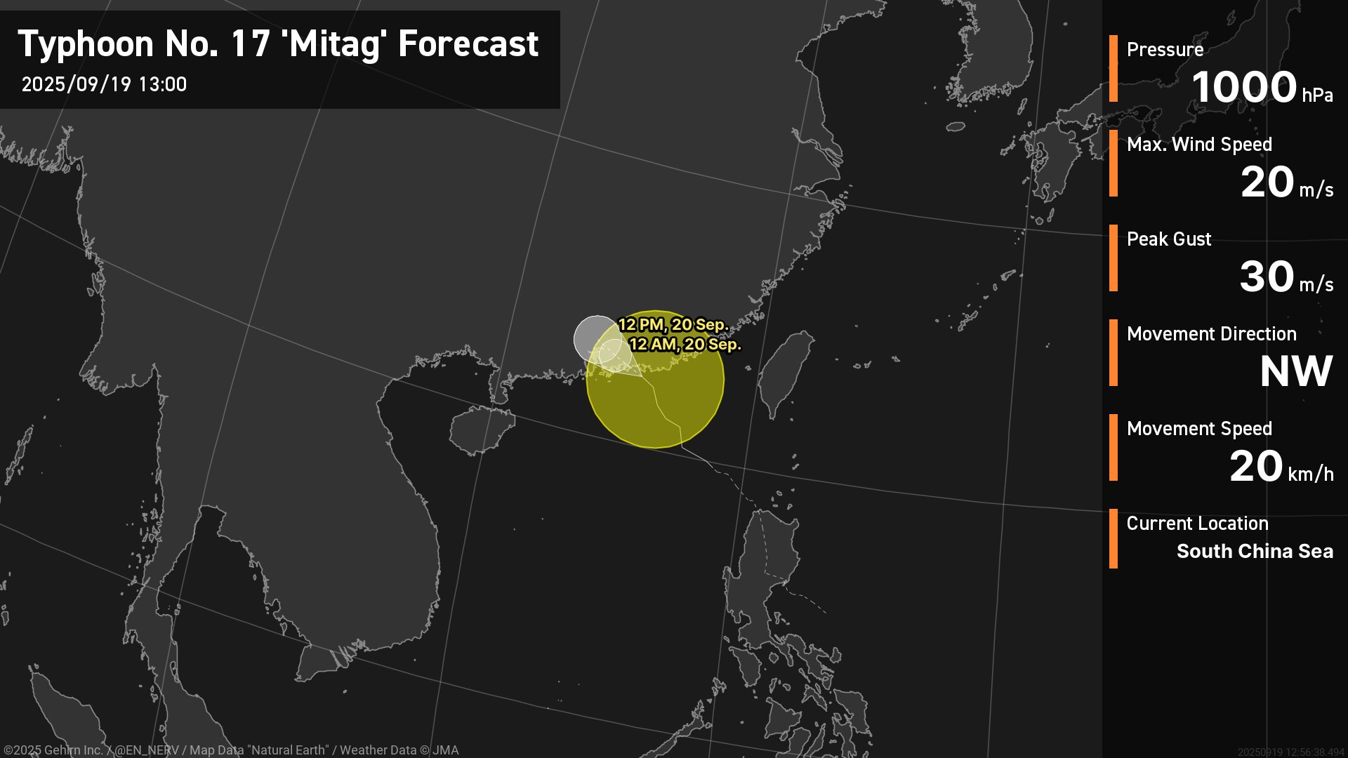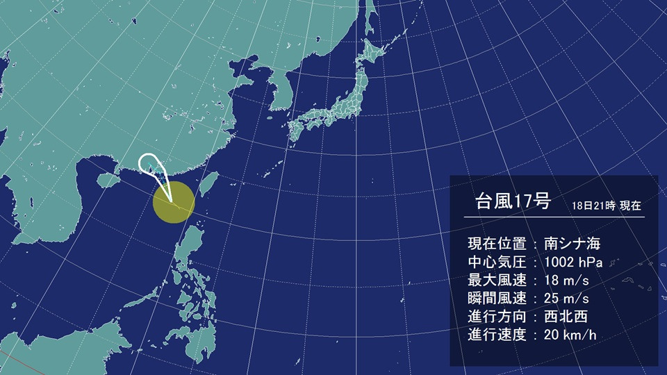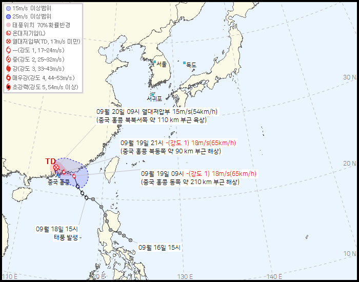 2025년 9월 19일 오전 9시 기준, 17호 태풍 경로 현재 위치는 중국 홍콩 동쪽 약 210km 해상에 머물고 있습니다. 중심기압은 약 992hPa, 최대풍속은 초속 18m 안팎으로 비교적 약한 ‘소형 태풍’ 단계입니다. 태풍의 이동 속도도 느려 시간당 10km 내외로 서쪽으로 이동하고 있으며, 빠르면 20일 오전 중 중국 남부에 상륙한 뒤 곧바로 열대저압부로 약화될 것으로 예측됩니다.