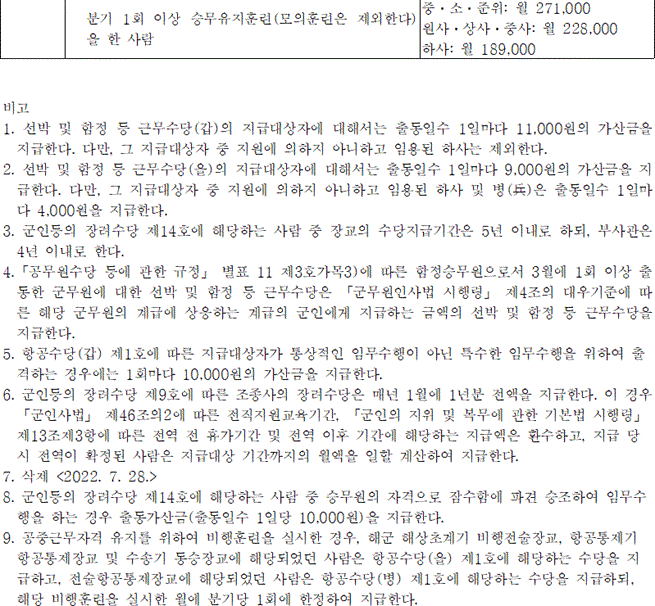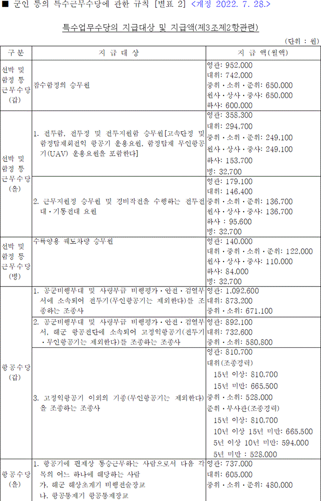 아래의 "군인등의 특수근무수당에 관한 규칙"은 2021년 3월 31일에 개정된 이래로 재개정되지 않았기 때문에 금액은 2025년 현재 동일합니다.