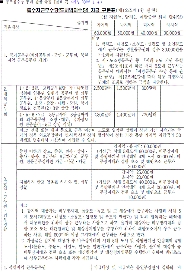 - 하사 ~ 중령: 월 60,000원 (갑, 을지역 동일)