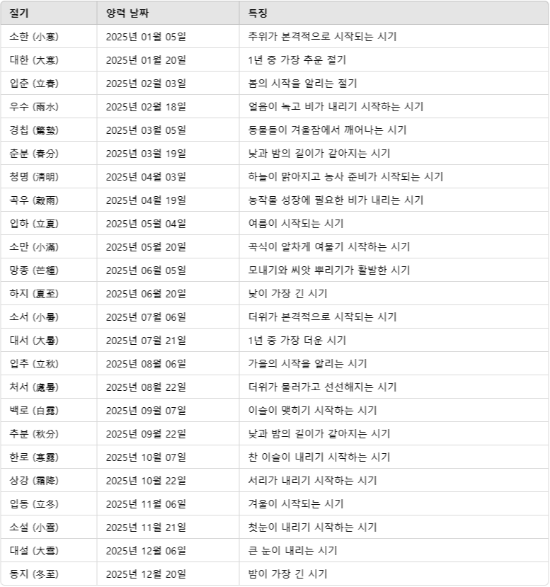 이번 포스팅에서는 2025년의 24 절기 양력 음력이 표기된 24절기표와 함께 각각의 유래와 특징, 그리고 관련된 풍습에 대해 더욱 깊이 알아보겠습니다.