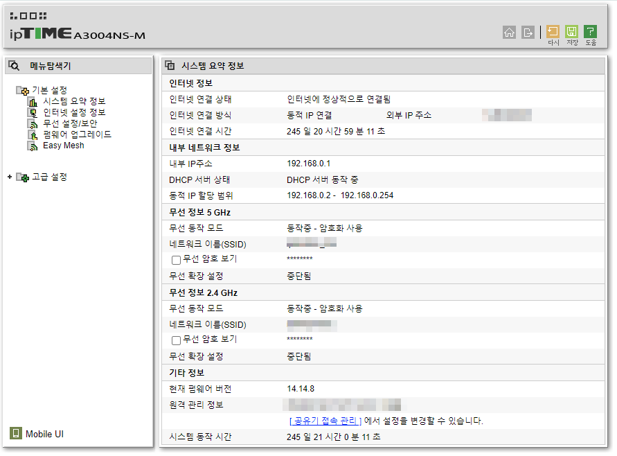 3. 좌측 메뉴에서 "시스템 관리" 또는 "공유기 정보"를 클릭합니다.